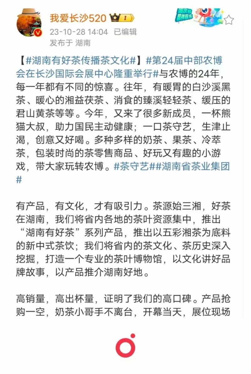 此次農(nóng)博會,集團一是繼續(xù)借助人民網(wǎng)、湖南日報、紅網(wǎng)、長沙晚報、湖南衛(wèi)視、湖南都市、長沙電視臺等傳統(tǒng)媒體,以高質(zhì)量高吸睛度的圖文報道和當下流行的短視頻報道增強品牌、產(chǎn)品、渠道宣傳力度。二是繼續(xù)利用自身官方網(wǎng)站、微信公眾號、視頻號、小紅書等新媒體同步轉(zhuǎn)發(fā)媒體報道和原創(chuàng)相關(guān)內(nèi)容,借助媒體高影響力和高關(guān)注度提高公司自有媒體平臺的粉絲和流量。三是加強與 我愛長沙、 嘉俊日記簿、 三湘頭條等網(wǎng)絡(luò)大咖的聯(lián)動,通過微博、百度、今日頭條同步宣傳推介集團品牌產(chǎn)品,集團參加此次農(nóng)博會情況登上長沙同城熱搜,“湖南有好茶傳播茶文化”話題討論熱度持續(xù)上漲。四是借力來展位打卡的網(wǎng)紅和名人如湖南衛(wèi)視著名新聞主播魏哲浩、湖南衛(wèi)視知名主持人杜海濤等,進一步吸引消費者、擴大茶產(chǎn)品銷售、提升品牌影響力,實現(xiàn)了人氣、銷量、口碑三豐收。