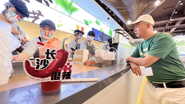 在其茶飲產(chǎn)品區(qū),一杯杯純茶產(chǎn)品在相繼制作中。同樣是用精品茶作為原材料,但不同于常規(guī)開水沖泡的方式,工作人員在用熱水萃出茶味之后,加入冰水固味降溫,成為一杯溫度適宜又茶味純正的茶飲產(chǎn)品。此外,該店同樣以精品茶為原材料,加入湖南優(yōu)質(zhì)牧場出品的鮮奶,或者湖南各地的特色果品,推出了一系列新品種?!白鳛橐患掖蛲ú璁a(chǎn)業(yè)上游產(chǎn)業(yè)鏈的企業(yè),我們有社會(huì)責(zé)任也看好市場前景,將湖南的好茶、好奶和好果子,通過產(chǎn)品的創(chuàng)新,融入到一杯杯茶飲中,呈現(xiàn)在消費(fèi)者面前?!?