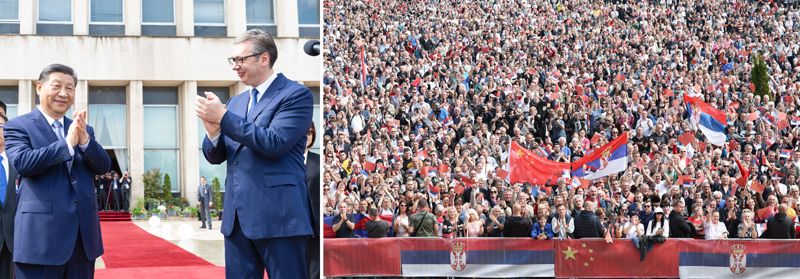 當?shù)貢r間5月8日上午,國家主席習近平在貝爾格萊德塞爾維亞大廈同塞爾維亞總統(tǒng)武契奇舉行會談。會談前,武契奇陪同習近平來到政府大廈平臺(左圖)。大廈廣場上,一萬五千名塞爾維亞民眾揮舞中塞兩國國旗,對習近平表示最熱烈的歡迎(右圖)。(拼版照片)新華社記者 黃敬文 丁海濤 攝