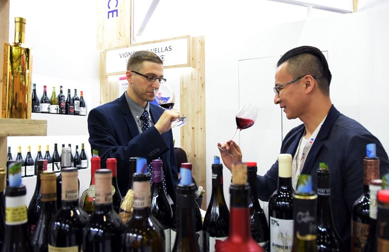 2021年6月1日,2021中國(guó)(北京)國(guó)際葡萄酒展覽會(huì)上,一名來自法國(guó)的參展商(左)邀請(qǐng)參觀者品鑒法國(guó)出產(chǎn)的葡萄酒。新華社記者 潘旭 攝