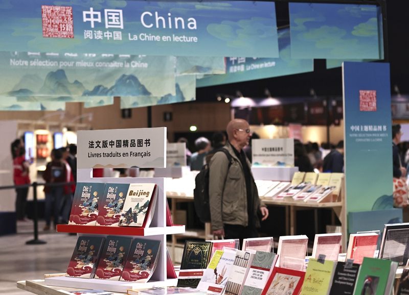 這是2024年4月12日在法國(guó)巴黎臨時(shí)大皇宮舉行的2024巴黎書展上拍攝的中國(guó)圖書展區(qū)一角。新華社記者 高靜 攝