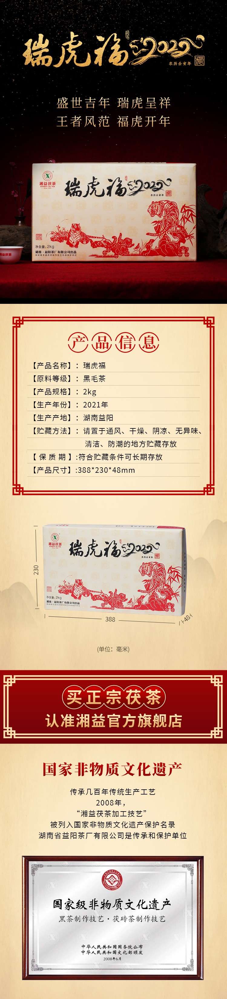 • 湘益獲茶湖南獲磚茶正宗安化黑茶2022新品虎年生肖茶瑞虎福2kg